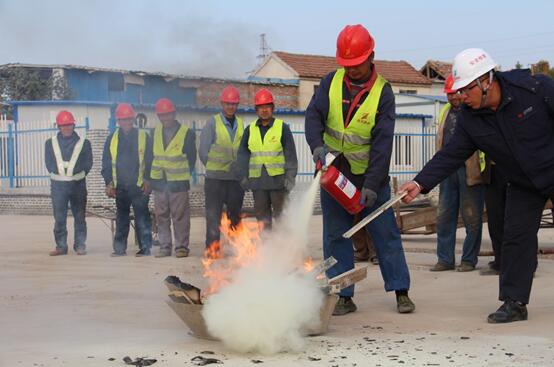 冬季是火災高發季節,為把消防安全工作落到實處,提高火災應急能力,讓員工熟練掌握滅火器的使用方法,確保消防安全, 活動現場,首先由安全科長莊景亮對施工人員普及宣貫如何避免火災、發生火災時如何自救逃生及火災應急處理相關注意事項等知識,并講解如何辯別、使用干粉式滅火器。隨后,對滅火器正確使用進行現場指導,同時大家逐一親身體驗滅火器的操作使用并進行現場滅火。最后,在項目部安全科人員組織指導下,企業員工有序的參加了以疏散、逃生、自救為主的消防演練活動。