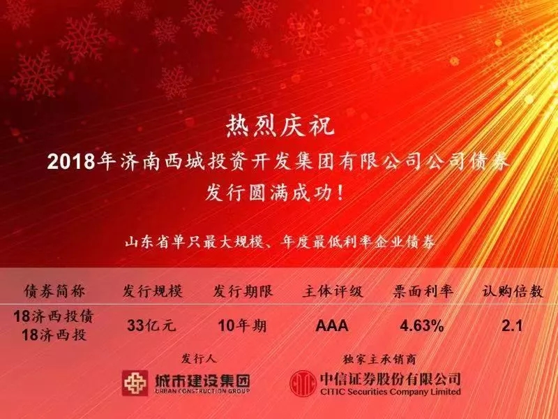 12月14日,濟南城市建設集團全資子公司濟南西城投資開發集團有限公司成功發行33億元企業債券,共有53家機構參與認購,認購倍數2.1倍,認購總額達到70億元,發行利率4.63%,期限10年。該筆企業債券創下多項省市企業債券發行之最,是我省2018年規模最大、本年度利率最低的企業債券,同時該筆債券融資也是濟南市有史以來獲批最大規模、今年唯一一筆企業債券。