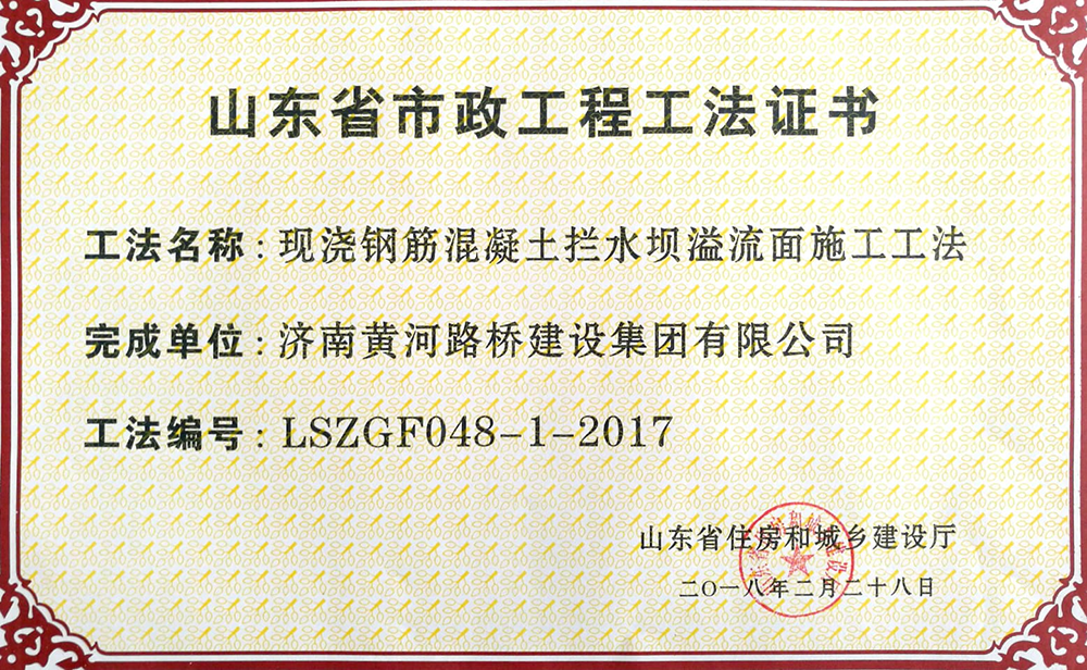2018年2月28日,濟(jì)南黃河路橋建設(shè)集團(tuán)公司申報(bào)的6項(xiàng)工法全部被山東省住房和城鄉(xiāng)建設(shè)廳批準(zhǔn)為山東省市政工程工法。
