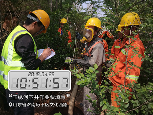 由于人工下井作業危險較大,方案制定完成后搶險小組立即向公司安全質量部進行匯報,經過安全質量部批準于4.26日進行人工下井作業?,F場工作人員嚴格按照下井作業施工流程,認真填寫《下井作業票》、《有限空間作業票》等最終將工作人員將阻塞在管口的立沿石等阻塞物取出,管道又恢復了正常運行,玉繡河也恢復了往日的清澈。
