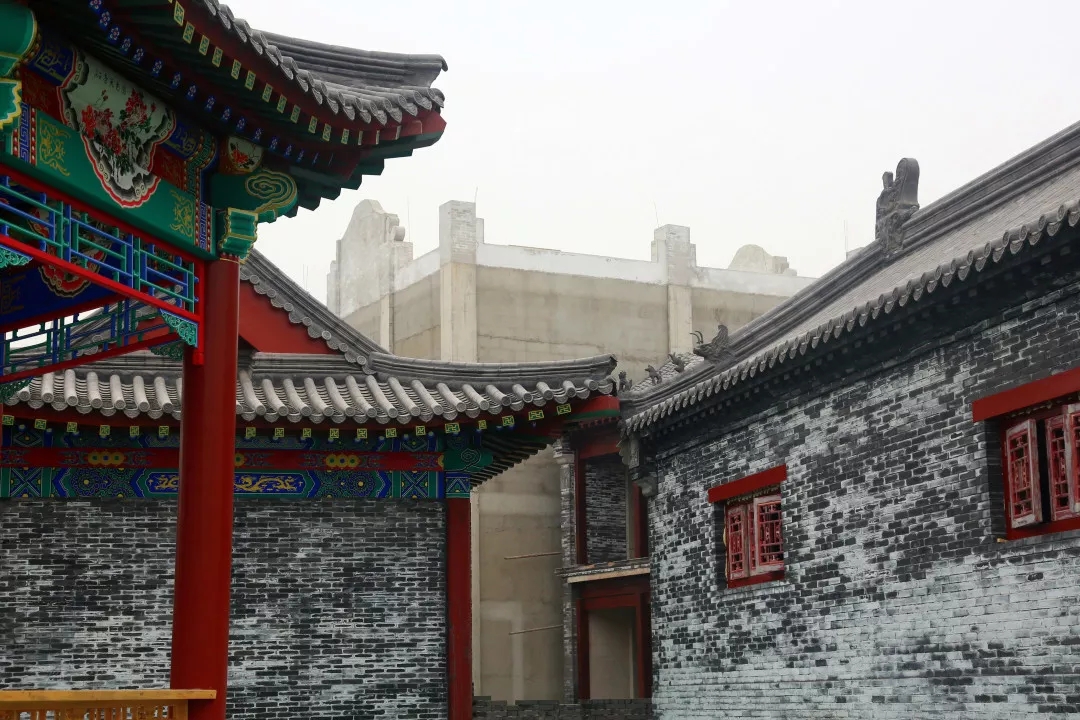 項目所有建筑中,城門樓是工程量最大、工期最長的單體建筑,其中,城墻全部采用手工磚砌筑,經過人工修整后的磚塊古樸素雅,并無過分雕飾痕跡。進入城門樓內部,柱與梁之間均為傳統木質斗拱支撐,城門樓的彩繪部分尤為明亮突出,采用的是旋子彩繪形式,一般經過6道工序,一平方米的彩繪需要一名繪畫師傅耗時約半天一次成型。
