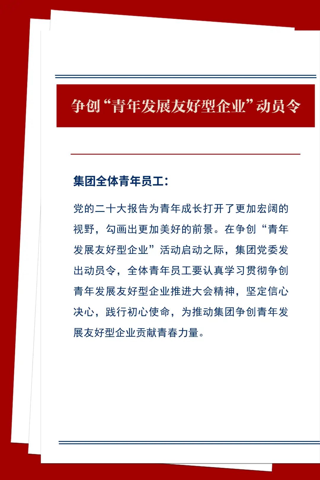 全體青年員工要以對(duì)黨和集團(tuán)高度負(fù)責(zé)的精神對(duì)待本職工作,主動(dòng)深入一線(xiàn),切實(shí)發(fā)揮青年人朝氣蓬勃的精神和干勁。進(jìn)一步強(qiáng)化黨建、團(tuán)建引領(lǐng)和政治保障,提高政治站位、強(qiáng)化使命擔(dān)當(dāng),帶頭響應(yīng)集團(tuán)爭(zhēng)創(chuàng)青年發(fā)展友好型企業(yè)號(hào)召,主動(dòng)宣傳、引導(dǎo)、以實(shí)際行動(dòng)帶動(dòng)身邊人參與到活動(dòng)中來(lái)。