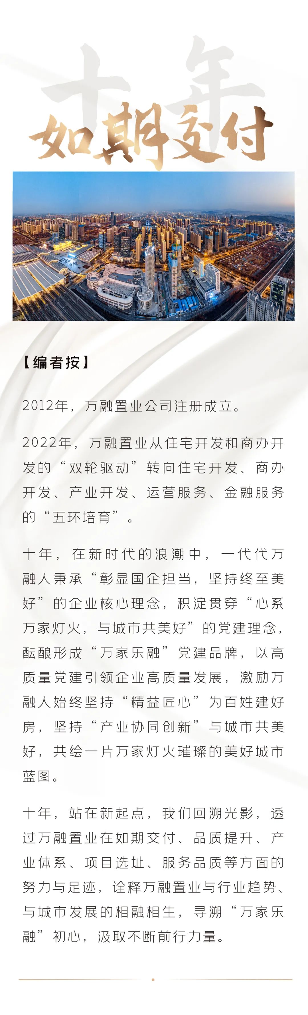 堅持人文關懷,追求營造高品質生活環境,讓城市品質融入萬家燈火,實現如期交付。在卓越如期交付的背后,是萬融置業品牌背書的實力護航和匠心堅持。