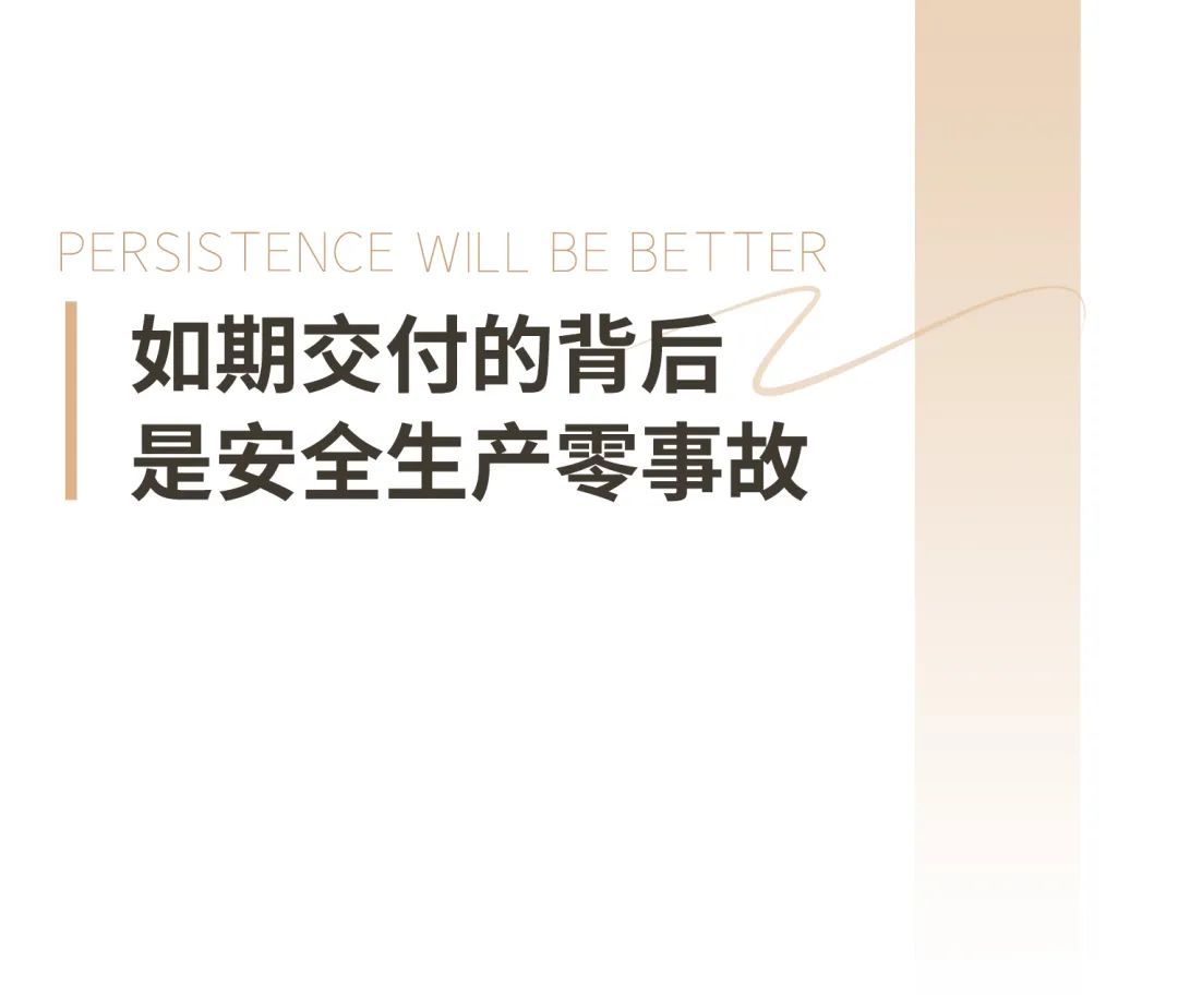 每個項目都要歷經上千個日夜的建設和精心打磨,始終秉持“安全第一,以人為本”的原則,充分發揮統籌組織和現場指揮能力,以安全生產為首要任務,整個建設周期達成安全生產零事故,為項目施工人員創造安全、健康的工作環境,維護現場人員的安全健康權益。通過嚴格的安全生產,確保產品品質,為業主建設安全、舒適、放心的家園。