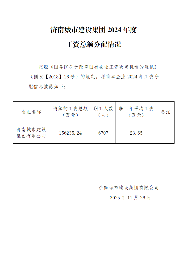 濟南城市建設集團2024年度工資總額分配情況