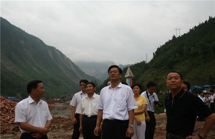 2008年8月,時任山東省委副書記劉偉(中)到擂鼓鎮視察災后援建工作